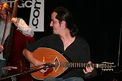 Taha's breakthrough album as a solo artist was his bestseller[4] Diwân, featuring remakes of songs from Algerian and Arab traditions. The album featured traditional instruments like the oud but with a "contemporary veneer of programmed percussion and samples added in."[4] Taha mixed the oud with strings using a contemporary beat along with guitar work, according to one account.[11] Taha's album Tékitoi, produced by Steve Hillage[7] and released in 2004, brought acclaim and recognition from other rock musicians. The title track is "street slang" meaning, roughly, Who the Hell Are You? (from the French Tu es qui, toi ? shortened into T'es qui, toi ?) and the music had "echoes of Joe Strummer", according to a review in The Observer.[18] In 2005 Taha performed with Robert Plant, Patti Smith and Brian Eno.[7] He covered The Clash song "Rock the Casbah" which he retitled with the Arabic name of "Rock El Casbah". This song appeared in the 2007 film about Clash frontman Joe Strummer entitled The Future Is Unwritten.[19] The song suggested rock music as "banned but unstoppable".[2] Taha performed the song along with The Clash musician Mick Jones.[13][20][21] The Guardian selected "Rock El Casbah" as one of the top 50 cover songs.[22]