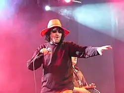 In 2008 he performed with the band Dengue Fever.[24] He was described as a ""wild Algerian punk fan" performing among a lineup which read like a "Who's Who of West African music", and was part of "Africa Express", a response to the lack of African musicians at Bob Geldof's Live 8 musical extravaganza.[25]