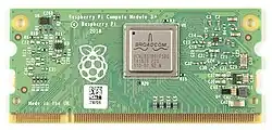 • Compute Module 3 (2017) – Based on the Pi 3. Includes a quad-core 64-bit Cortex-A53 CPU, 1 GB RAM, and 4 GB eMMC; also available as a "Lite" variant without eMMC. SO-DIMM form factor.[98]