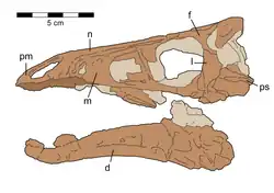 The holotype, ROM 1790, was found in a layer of the lower Dinosaur Park Formation, dating to the late Campanian. It consists of a partial skeleton, including the snout, the front lower jaws, the last back vertebra, six sacral vertebrae, sixteen front tail vertebrae that may or may not have formed a natural series, the complete pelvis, and the hindlimbs (minus the right toes). Many of the bones are damaged and compressed. It is part of the collection of the Royal Ontario Museum.[1]