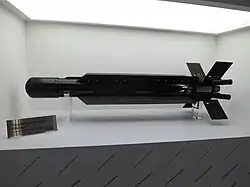 Raytheon then developed a Block 2 variant equipped with a jet engine, improving speed and loiter time to engage larger and further targets.[10][11] The Coyote Block 2 features improved sensors and a turbine engine to increase speed to 345–370 mph (555–595 km/h).[8][15][16] On 17 March 2020, Raytheon was cleared to sell the Coyote Block 2 interceptor as part of the Howler system after entering U.S. military service. Leveraging commercial off-the-shelf components, the interceptor is cheap enough to be used against large drone swarms. Four control fins pop out around the tail to make it maneuverable enough to close in on evading targets. It is fitted with a warhead producing a fragment field of small, fast-moving shrapnel optimized to destroy small drones.[17][18] Using a rocket booster with a turbine sustainment motor, it can engage threats at ranges of 10–15 km (6.2–9.3 mi), and can even re-attack if it misses on the first pass.[16][19] It has a loitering with re-engagement capability and is able to remain airborne for up to four minutes.[20]