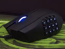 The name Razer Naga is believed to be based on both the Sanskrit word for "snake" and possibly Naga, a World of Warcraft race.[1] The first Razer Naga was announced at Gamescom 2009[1] and released in August 2009.[2] The first version of the Naga had a total of seventeen buttons,[3] with twelve being on the left side of the mouse, and a switch on the underside of the mouse that maps them to the keyboard's top number buttons or its numeric keypad.[2] The original Naga had a maximum sensitivity of 5,600 DPI.[3] Downloadable software by Razer called AddOns allowed the user to map what each key did.[2] The Naga Epic, which was released in November 2010, was the first installment in the Naga series to have wireless functionality. It was also released with an interchangeable side panel and the ability to change the color of the lights from a pool of sixteen million colors.[4] A redesigned version of the original Naga, called the Naga Molten,[5] was released in early 2011.[6]