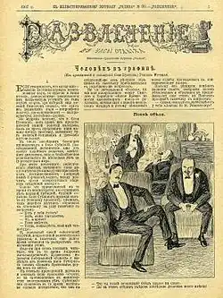 Razvlecheniye (Russian: Развлечение, Amusement) was a Russian illustrated weekly magazine published in Moscow in 1859–1916. Launched and (up until 1881) edited by Fyodor Miller, it specialized in humour and caricatures, but also contained a large and popular literary section. Among its regular contributors were Boris Almazov, Vladimir Dal, Alexander Levitov, Dmitry Minayev, and (caricaturist) Lavr Belyankin. Three Anton Chekhov's early stories first appeared in Razvlecheniye in 1883–1884.[1]