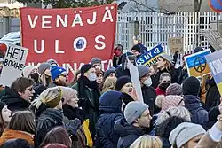 There were also immediate worldwide protests against the invasion and daily protests in Russia itself.[14] As well as the demonstrations, petitions and open letters were published in opposition to the war, and public figures, both cultural and political, released statements against the war.[15] The protests were met with widespread repression by the Russian authorities. According to OVD-Info, at least 14,906 people were detained from 24 February to 13 March 2022.[16][17] The Russian government cracked down on other forms of opposition to the war, including introducing widespread censorship measures and repression against people who signed anti-war petitions.[18] In July 2022, Moscow city councillor Alexei Gorinov was jailed for seven years for criticizing Russia's invasion of Ukraine, the first time someone went to jail under the new Russian 2022 war censorship laws.[19] Meanwhile, other Russians, including Alexandra Skochilenko and Vladimir Kara-Murza, await similar trials.[20] As well as the protests, there were also reported instances of anti-Russian sentiment and discrimination against the Russian diaspora and Russian-speaking immigrants as a result of the war.[21][22] Ukraine has decided to rename the streets of Ukrainian cities named after Russian historical figures like Tchaikovsky or Tolstoy.[23] In some parts of Ukraine that were newly occupied by Russian armed forces, protests against the occupiers took place.[24][25]