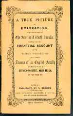 Rebecca Burlend (1793โ1872) is the author of A True Picture of Emigration, a journal and guide written during the period of 1831โ1845. (The full title is A True Picture of Emigration or Fourteen Years in the Interior of North America Being a Full and Impartial Account of the Various Difficulties and Ultimate Success of an English Family Who Emigrated from Barwick-in-Elmet, near Leeds, in the Year 1831.) She published it anonymously in 1848, receiving credit for the work in 1936.