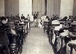 The Recreio da Juventude was created on December 28, 1912, as a dissidence of the Clube Juvenil, by 29 young people in a house owned by José Bragatti, at 66 Júlio de Castilhos Avenue.[1] Its name came from a provision in its first statute that admitted only single men; this restriction would soon be repealed. The first to assume the presidency was Ferdinando Jaconi. The official ceremonies to inaugurate the social headquarters took place on February 4, 1913, and began with a procession of ladies that left Ludovico Sartori's house in the morning carrying the flag made by the families of Caxias, which was delivered to the president in the first headquarters at Dante Alighieri Square, among cheers and speeches. Afterwards, there was a lunch at the Firenze Hotel, a civic march down Julio Avenue in the afternoon, and in the evening, the solemn inauguration of the board of directors and a dance that extended into the early hours of the morning.[2]