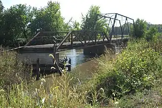 The Red Bridge is located just northeast of Monroe, Iowa, United States. The 212-foot (65 m) span carried traffic on County Road S74 over the South Skunk River. This is one of the few Warren truss bridges built in Iowa in the 19th century.[2] Local bridge contractor H.S. Efnor built the main span for $3,515.34 in 1892.[2] It received considerable damage in a 1947 flood, and the county replaced one of its steel cylinder piers with a concrete pier, and added the pony truss approach span on the north side. It has subsequently been closed to traffic.[3] The bridge was listed on the National Register of Historic Places in 1998.[1]