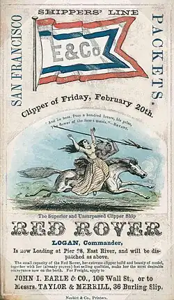 A second clipper named Red Rover, active in the California trade, was built by Fernald & Pettigrew in 1852.[4] Between 22 January – 2 May 1854, the ship sailed from New York to San Francisco in 120 (122) days. The Seaman's Bride and Winged Racer which left New York one respectively two days after the Red Rover arrived at San Francisco on 23 May.[5]
