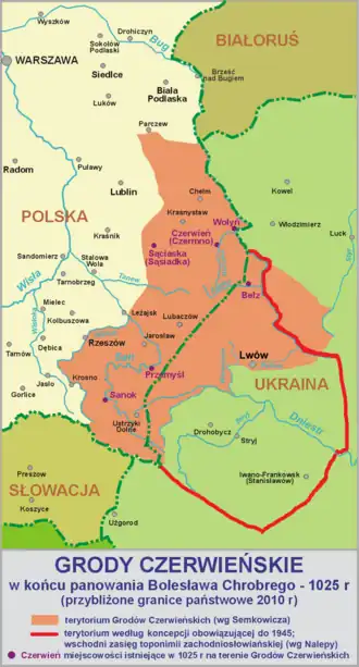 The Cherven Cities (Polish: Grody Czerwieńskie), Czerwień Cities or Cherven Gords (Ukrainian: Червенські Городи), often literally translated as Red Cities, Red Forts or Red Boroughs, was a point of dispute between the Kingdom of Poland and Kievan Rus' at the turn of the 10th and 11th centuries, with both sides claiming their rights to the land.