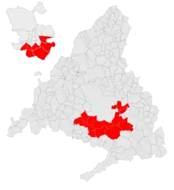 The expression red belt (Spanish: Cinturón rojo) is used to designate in the Community of Madrid, since the return to democracy in the last decades of the 20th century, the set of cities located in the southern part of the metropolitan area of the city of Madrid, characterized by their high population of workers or the working class and because of their long history with mayors of the Spanish Socialist Workers' Party or other left parties and coalitions such as the Communist Party of Spain or the United Left. The municipalities represent a total of 21% of the population residing in the Community of Madrid, with six out of the ten most populated municipalities of the region belonging to the red belt.[1][2][3][4] The name is also used to talk about the southern districts of the city of Madrid.[5]