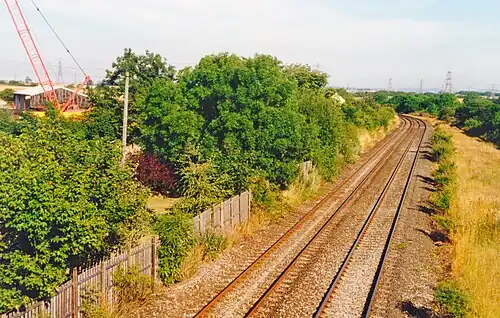 ![]() Site of the former Redmarshall station looking SE along the former Clarence Railway main line towards Stockton. 9 August 1995. | |||||