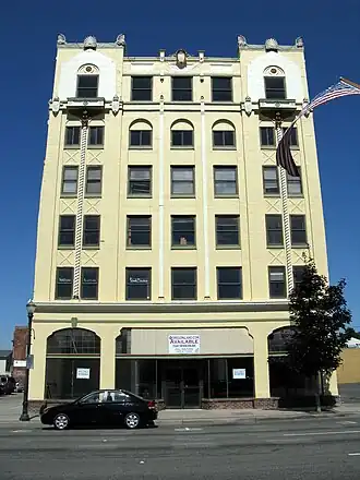 The Redwoods Hotel, also known as the Redwood Towers, is a historic six-story hotel building located at 306-310 Northwest 6th Street in Grants Pass, Josephine County, Oregon. Built in 1926 of reinforced concrete with cast concrete art deco ornamentation on its front facade, it was designed by the architectural firm of Tourtellotte and Hummel, noted for the many buildings it designed in Idaho and Oregon. Its builder was R.I. (Richard Irwin) Stuart, of Medford, Oregon, who completed it in 6 months. It was built as an expansion of the adjacent 3-story brick Josephine Hotel and originally contained 45 hotel rooms with retail space on its first floor. The old Josephine Hotel was completely gutted by fire in 1975 and was razed. After the fire, the owners of the Redwoods Hotel made the decision to convert its upper floors to office space.[2]