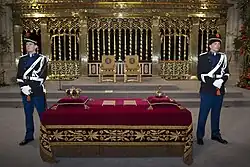 The regalia of the Netherlands consists of a number of items symbolising the Dutch monarch's authority and dignity. In comparison to many European monarchies' regalia, the Dutch regalia are relatively new: having been commissioned by King William II in 1840. An earlier, more modest set of regalia made of silver was commissioned by King William I in 1815.[1]