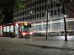 A trolleybus on Broad Street in 1965. The movie theatre and department store were later demolished. Regina saw a number of buildings demolished from 1945 to the 1970s.