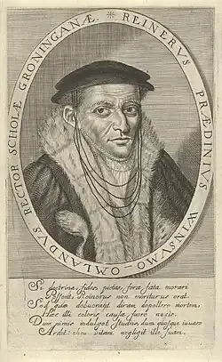 Regnerus Praedinius or Reinier Veldman (1510 โ 1559) was a Dutch humanist, rector, reformer, and teacher. The Praedinius Gymnasium in Groningen is named after him. Johannes Acronius Frisius, Volcher Coiter, and Abel Eppens were among his students. He was born in Winsum as Reinier Veldman. He studied theology at the Fraterhuis in Groningen, and at Leuven, before becoming the rector of the St. Maartens school. He began to find problems in the Catholic Church and sought to reform the system. He was an admirer of Desiderius Erasmus. He later Latinized "Veldman" (or field man) using the word praedium to Praedinius. Reinier was likewise altered through the word "regnare" (to govern) to Regnerus.[1]