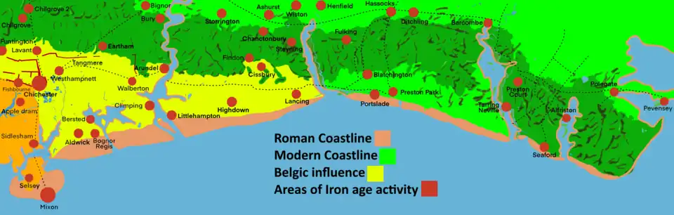 This central area likely served as the heart of the Belgic-influenced Regni tribe, stretching from the boundaries of Hampshire to the Trisantona Fluvius (the River Arun), meeting the English Channel at Littlehampton. The tribes outside this core area in the Sussex Weald were likely predominantly indigenous Brythonic communities who interacted with the Belgic-influenced Britons along the West Sussex coast. Regini, appearing to have been predominantly influenced by the Atrebates, could have been either a branch of the Belgic Atrebates or part of a confederation of smaller tribes predating the Atrebates' presence in Sussex and Hampshire. Despite seemingly avoiding complete submission to the Atrebates and maintaining some autonomy, their close ties to them were apparent, with Noviomagus serving as an early capital for the Atrebates, strategically positioned near a coastal area convenient for Celtic migrations from the mainland.[18][19]