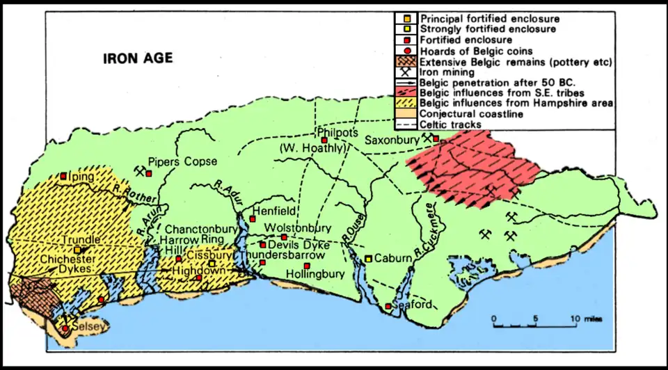 Following the initial 'conquest' and subsequent power shifts, Sussex stabilised into a new order. The influence of the Atrebates extended toward the Ouse and partially into the Weald, while tribes in the northeast and Kent maintained a more defensive stance, with Mount Caburn being a strongly fortified boundary town. The new ruling class notably abandoned the large developed hill-forts at the Trundle and Cissbury in favour of sophisticated urban centres on the coastal plain. This was particularly in the Selsey-Chichester area, which has since succumbed to coastal erosion.[14]