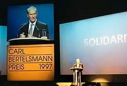 After addressing issues relating to educational, social, business and economic policy, the Carl Bertelsmann Prize focused on health care in 2000.[24] Democratic processes were a topic several times, especially those in Eastern Europe and South America.[25] By awarding the prize to Transparency International, the Bertelsmann Stiftung set an example in the fight against corruption.[26][27] Over the years, moreover, the Carl Bertelsmann Prize attracted greater attention in the political sphere; among others, Federal Interior Minister Otto Schily (2004), State Premier Jürgen Rüttgers (2005) and Federal President Horst Köhler (2006) all gave presentation speeches at the award ceremony.[28][29][30]