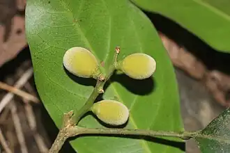 The leaf is imparipinnate, characterized by a slender rachis measuring 4.2 to 11.5 cm (1.7 to 4.5 in) in length. It exhibits a swelling at its base, and is devoid of hairs. The leaf comprises 5–9 alternate leaflets, with each leaflet lacking stipules. Leaflets are attached to a slender petiolule measuring 5 to 8 mm (0.20 to 0.31 in) in length, that is also hairless. The lamina of the leaf is elliptic, lanceolate, or elliptic-obovate in shape, ranging from 5 to 15 cm (2 to 6 in) in length and 1.5 to 5.5 cm (0.6 to 2.2 in) in width. Its base is oblique, attenuate, or cuneate, while the apex varies between acuminate, obtusely acuminate, or caudate-acuminate. All leaves possess a smooth margin and a tough, leathery texture. The leaf features 8–10 pairs of pinnate, prominent lateral nerves, accompanied by visible intercostal reticulations. The leaf also possesses domatia within its structure.[4]