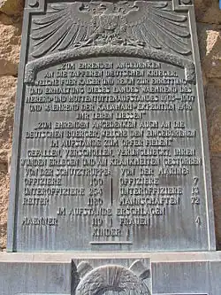 Remembering and honouring the brave German warriors that died for emperor and empire to save and protect this land during the Herero and Hottentot uprisings between 1903 and 1907, and during the Kalahari Expedition in 1908. Also remembering and honouring German citizens that died from the hands of the indigenous. Fallen, missing, died from accident, succumbed to their injuries or sickness: Of the Protection Force: 100 officers, 254 non-commissioned officers, 1180 soldiers, of the marine: 7 officers, 13 non-commissioned officers, 27 seamen. Killed during the uprising: 119 men, 4 women, 1 child.