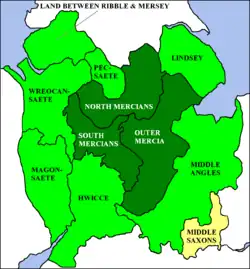 The first kings of Mercia were pagans, and they resisted the encroachment of Christianity longer than those of other kingdoms in the Anglo-Saxon Heptarchy. Placenames like Wednesfield and Wednesbury perhaps suggest that the worship of Woden was particularly prominent, and that there was a cluster of late pagan practice near Birmingham: there are no surviving toponyms relating to Thunor, for example, although Tiw may be connected to Tyseley, Tysemere and Tysoe. Similarly the Old English word weoh (altar) is found as a root for several Mercian placenames including Weeford near Lichfield.[2]