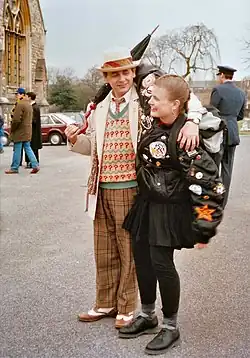 Remembrance of the Daleks, the first story in Doctor Who's twenty-fifth anniversary season,[10] contains many references to the series' past, something Aaronovitch felt was fun.[9] It is set in the same time and place as the programme's first episode, "An Unearthly Child", where Coal Hill School employed original companions Ian and Barbara and the Doctor's granddaughter Susan was enrolled.[9] The Totter's Lane junkyard also reappears, as it had in season 22's Attack of the Cybermen, though "I.M. Foreman" is misspelled "I.M. Forman".[11] It originally read "L.M.", though that was changeable in production.[7] In one of the classrooms, Ace picks up a book on the French Revolution just as Susan had in "An Unearthly Child"; Aldred studied the original to try to mimic Carole Ann Ford's stature.[9] The Doctor references the events of The Dalek Invasion of Earth (1964), Genesis of the Daleks (1975), Terror of the Zygons (1975), and The Web of Fear (1968), as well as likening a device to something he used in Planet of the Daleks (1973).[7][9] The Doctor mistakenly calls Group Captain Gilmore "Brigadier", a reference to Brigadier Lethbridge-Stewart, who had headed UNIT, an organisation similar to Gilmore's. Rachel, a scientific advisor from Cambridge, is similar to Liz Shaw, and she shares a conversation with Gilmore that is reminiscent of a conversation between the Brigadier and Liz in Spearhead from Space (1970).[9] Rachel also bears a physical resemblance to Barbara.[9] Remembrance of the Daleks is also contains a meta-reference; a television continuity announcer says, "This is BBC television, the time is quarter past five and Saturday viewing continues with an adventure in the new science fiction series Doc—", but is cut off by a scene change before completing the title. Aaronovitch "couldn't resist" the reference, and clarified that it was meant as a joke and was not to be taken seriously.[9] Originally, it was intended that the show that was introduced would be called Professor X.[7] Alison and Rachel make mention of a "Bernard" from the "British Rocket Group". This is a reference to Bernard Quatermass and his British Experimental Rocket Group, of the Nigel Kneale-penned Quatermass science-fiction television serials.[11] Several scenes from Remembrance of the Daleks were cut or edited in production. McCoy's favourite scene, in which the Doctor muses to a worker at a café, was cut by about half.[12] As originally shot, Ace defused the tension between her and the Doctor when he left her at the boarding house.[12] Also cut was the Doctor curing Ace's leg at the beginning of the third episode, and the issuing of instructions from the Dalek controller through an earpiece.[12] In a notable deleted line, the Doctor tells Davros that he is "far more than just another Time Lord".[12] This, along with the Doctor's hints that he was present at the creation of the Hand of Omega, was part of the so-called "Cartmel Masterplan" by script editor Andrew Cartmel to restore some of the mystery to the Doctor's origins.[13] However, as the programme ceased production in 1989, the intended revelations never came to pass.[14] The original script also had the Doctor blowing up a Dalek with the anti-tank missile in episode two, but McCoy felt this was out of character and suggested Ace should do it instead.[8]