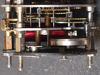 The gravity remontoire was invented by Swiss clockmaker Jost Bürgi around 1595. Usually the "Kalenderuhr" (three month running, springdriven, calendar-desk-clock) Bürgi is considered the oldest surviving clock with a remontoire, even if it does not provide power to the escapement during the few seconds of the daily cycle where the remontoire weight gets wound up by the spring.[2] Today remontoire mechanisms are all designed to deliver power to the escapement during the remontoire reset cycle.