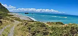 In 2013 the Rail Trail became part of a Great Ride route linking Petone via Maymorn, Cross Creek, Ocean Beach and Ōrongorongo in a loop.[5] The first 35 km (22 mi) of the Ride follows Hutt River Trail to Maymorn. The next 25 km (16 mi) uses the Rail Trail to reach Cross Creek. Another 42.5 km (26.4 mi) of the Ride is then on Western Lake Road, passing Lakes Wairarapa and Ōnoke, to reach Palliser Bay at Ocean Beach. A rough farm track runs 18 km (11 mi) via Turakirae Head to the end of the Ride at Ōrongorongo. Due to soft sand near the beach and rough rocks over stream fans, a few short sections of the track cannot be cycled. From Ōrongorongo it is 30 km (19 mi) back to Petone. A road runs via Wainuiomata,[6] or a fractionally shorter route, largely on cycleways and with less climbing, is via Baring Head, Pencarrow and Eastbourne to Petone.[7] In 2019/20 Remutaka was the third most popular of the 22 Great Rides then in use, with 218,770 cycle and walking trips, though only 1,976 completing the whole Ride, as it "lacks sufficient infrastructure".[8]