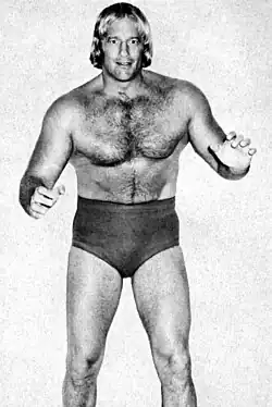 Gotch and Goulet dropped the belts to Baron Mikel Scicluna and King Curtis Iaukea at the next television taping on February 1, 1972, staying on a few more months before looking for new opportunities. Discussing the training that helped Goulet gain wrestling skills, he stated "Sometimes, you didn't even know this guy standing in front of you. Some guys you'd go in against were horrible, and it wasn't just a matter of having a good match, it was a matter of protecting yourself. It was all ad-lib...there was no script. In my time, you went in the ring and you worked. You went from move to move, without having any idea what was coming next."[4] Goulet worked briefly in Germany in the early 1970s, with promoters deciding to name him "Buddy Rogers Jr." in reference to Buddy Rogers.