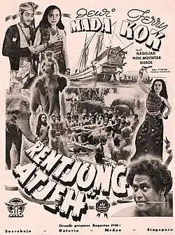 Rentjong Atjeh was premiered in 1940 at the Sampoerna Theater in Surabaya, and was screened on 13 August 1940 at Rex Theater.[10] Before that, the film's story had been serialised and the sheet music for its soundtrack was published as a promotional booklet.[11] The film was also screened in British Malaya, where it was advertised as "the first great Malay historical drama".[12]