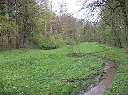 The Drama river (locally Repecki Ditch) flows through the park's center, dividing it into a northeastern section – the main landscape park shaped in the late 19th century – and a southwestern section, remnants of the former hunting preserve near Mikołaj Hill (318 meters above sea level).[5][8]
