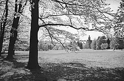 In 1893, Karol's son, Guido, began constructing a grand palace in the preserve's center, designed in the German Renaissance Revival style by renowned Munich architect Gabriel von Seidl. The preserve was reimagined as a residential English landscape garden[5] (Reptener Park).[2] This involved moving hundreds of thousands of cubic meters of earth, flattening and rounding hills, filling valleys, and leveling elevation differences.[3] A forest section along the Drama river (Repecki Ditch) was cleared to create meadows, maintained today by regular mowing.[3][6] Approximately 10,000 trees, mostly beeches and oaks, were planted to enhance the existing stands, alongside exotic species from North America and East Asia, including eastern hemlock, Douglas fir, Sawara cypress, eastern white pine, three oak species (northern red, Hungarian, and pin), four maple species (silver, fullmoon, striped, sugar), tulip tree, and cucumber tree.[6][7][8] The design ensured a gradual transition from the man-made park near the palace to natural forest and meadows farther out.[9]