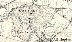 In 1824, Count Carl Lazarus Henckel von Donnersmarck of Świerklaniec acquired the Repty estates, including the park's current area, from the heirs of the Larisch family, former village owners. On the eastern edge of the existing forest, atop a hill along the road from Stare Tarnowice to Repty (now Repecka Street), he built a small hunting lodge (German: Jagdschloss Repten) in the 1840s. The forest was converted into a hunting preserve (German: Reptener Tiergarten),[2] enclosed by a limestone wall (parts of which survive today),[3][4] stocked with deer and pheasants.[5] To facilitate hunting, the central and northern forest sections were cleared, and a wide path was cut for shooting directly from the lodge.[3]