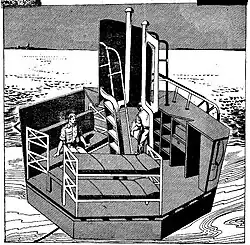 The buoys were of square or hexagonal construction and had a floor space of about 4m² (43 square feet) with an 2.4m (8 feet) tall cabin rising above the float. On the upper deck of this cabin, there was an oval turret 1.8m (6 feet) high with a signal mast carrying a wireless antenna. Tube railings to which the distressed flyers could cling ran along the outer circumference below and above the water line. A ladder led up to the turret, in which there was a door opening into the cabin below. A 100m (320 feet) red and yellow striped rope anchored the buoy at a fixed location, but allowed a limited drift, thereby indicating the direction of the current to aircraft in distress. The buoy was painted light yellow above the water line, and red crosses against white oval backgrounds were painted on each side of the turret.