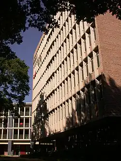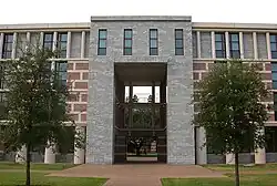 Wiess Hall was completed in 1949, but carried the name "North Hall" until its dedication in March 1950.[50] It was laid out as a W-shaped building, with three north–south wings, joined on the north ends by a long east–west spine, forming two open quadrangles.[51] The building was two stories high except for the three-story center wing. The hall was designed to house about 200 students in 20 single and 90 double rooms. Each room at Wiess opened directly to an exterior walkway that wrapped around the entire building. This design incorporated two features that were innovative at the time: every room had a semi-private bathroom and every room (except room 228, which was reserved for freshmen) had windows on at least two sides—an important adaptation in the years before air conditioning.[52]