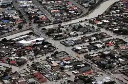 RNZAF aerial survey of damage, showing flooding due to soil liquefaction in Christchurch; most of the land in the image was later red-zoned and all structures demolished
