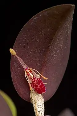 The flowers develop one at a time at the base of the leaf and reach a length of about 2.3 cm.[2] They are borne on a slender peduncle, originating from the base of the back of the leaf.