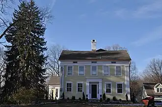 The Reuben Curtiss House is located in a rural-suburban setting east of the center of Southbury, on the west side of Bucks Hill Road south of Luther Drive. It is a 2+12-story wood-frame structure, with a gabled roof, central chimney, and clapboarded exterior. A series of ells extend the building to the rear. The front facade is five bays wide, with broad corner pilasters rising to an entablature and frieze containing embedded small attic windows. The main entrance is at the center of the facade, set in a recess with sidelight windows; the recess is framed by pilasters and a corniced entablature. The rear sections of the house are finished in a combination of Colonial and Greek Revival elements that blend with the features of the main block. The interior of the house is finished in a variety of styles, reflecting the building's long life oand a variety of uses.[2]