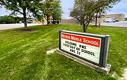 In November 1958, voters passed (57% in favor) a bond to build the $750,000 junior high school on the corner of Spring Valley Road and Revere road. It was built to house the sixth, seventh, and eighth graders with the plan to move 9th grade there when the high school's “population approaches 550 from its present 435.” In November 1959, voters passed a second bond issue to account for construction overruns, to add a wooden gym floor, and to build a $50,000 bus garage. Eastview Junior High opened in the fall of 1960 with “six hundred pupils in grades six, seven, and eight accommodate in 20 modern classrooms” with Esther Burkett serving as the principal. The official dedication occurred on Sunday, April 16, 1961. Eastview became a true Junior High in the fall of 1961 when freshmen were added and the six graders were relocated to the elementary buildings (Hillcrest, Bath, and Richfield). Eight Additional classrooms were completed to account for the change. Freshmen were still afforded the opportunity to participate in high school activities (sports, Lantern, National Forensic League, etc.). In 1975, freshmen returned to the high school and Eastview was a 7–8 building. In 1992 a bond passed to add major renovations to Revere Middle School. The groundbreaking occurred on November 15, 1993. A new wing was added to the west end of the school, which included a new library, science rooms, and 6th-grade classroom hallway. It also included a new gymnasium with locker rooms. Construction was completed in 1994. In 1994 with the building additions and the closing of Richfield School, 6th graders were added to Revere Middle School making it a grade 6–8 building. In ???? Eastview adopted the Patriot as their mascot.