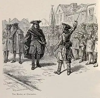 In early November, word arrived in Charleston of an approaching Spanish fleet.[3] Leading community members expressed concern at the city's defensive works which, due to neglect owing at least in part to the detached disinterest of the proprietors, were in a dilapidated state.[2] During the militia muster called for the third week of that month, officers and soldiers began associating into an informal organization intent on usurping power from the proprietors.[3] Among them was Colonel James Moore, Jr. and Arthur Skeene, the Speaker of the Commons House of Assembly.[3][4]