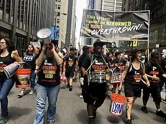 In December 2016, party members and others co-initiated Refuse Fascism, a coalition group aiming to "drive out" the Trump administration through sustained street protests.[69] InfoWars and other far-right conspiracy theory websites claimed the RCP and Refuse Fascism were organizing a military overthrow of the government on November 4, 2017.[70] Several nationwide anti-Trump protest marches were organized for that day, numbering in the thousands.[71][72]