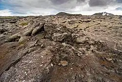 The Reykjanes Peninsula is a continuation of the mostly submarine Reykjanes Ridge, a part of the Mid-Atlantic Ridge. Its topography was formed by glaciers and volcanism, with basaltic lava fields covering a good part of the peninsula, in between volcanoes of subglacial as well as subaerial origin, namely tuyas, hyaloclastic ridges (tindars), shield volcanoes and crater rows.[1]