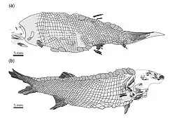 Rhadinichthys is an extinct genus of prehistoric bony fish. It is known from several species that lived in the Late Devonian epoch, the Carboniferous period and the Cisuralian epoch (early Permian) in what is now Europe, South Africa, and North and South America.[1] Some isolated scales from the Cisuralian of Europe (Belgium, France, Russia) were also referred to this genus.[1]