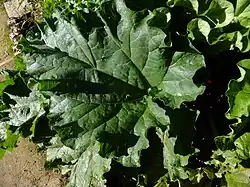 Leaves It has a stout, 30–45 centimetres (12–18 in) long petiole on its basal leaves[1] which is shorter than blade and papilliferous.[3] Leaves are leathery,[1][3] and green on the upper side and muricate on the lower,[3] or papillose or glabrous.[1] The shape of the leaf blade is entire,[1] orbicular,[1] cordate (heart-shaped),[3] reniform-cordate[3] to reniform (kidney-shaped)[1] in shape, 10–60 centimetres (3.9–23.6 in) long[5] (more usually 20–25 centimetres (7.9–9.8 in)),[3] from 10–50 centimetres (3.9–19.7 in) (more usually 25–30 centimetres (9.8–11.8 in)) wide,[1][3] and with the blade shorter than wide.[3] The leaf blade has five[1][3] to 7,[1] nearly basal, main veins. The apex (tip) of the leaf blade is obtuse (rounded)[1][3][5] or subacute (slightly pointed),[1][5] the margin is slightly sinuolate (wavy),[3] and the base is broadly cordate.[3] The upper leaves on the inflorescence stem are smaller and are ovate in shape.[1][3]
