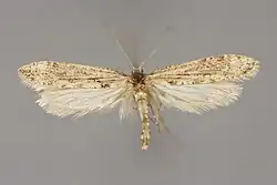 The wingspan is 19–23 mm. The head is fuscous mixed with whitish. Tuft of palpi very short. Forewings are fuscous, somewhat whitish-marbled, more strongly posteriorly, with scattered blackish strigulae, especially on costa : a small whitish spot on dorsum towards base, a large triangular one about middle, and another before tornus, blackish -dotted on dorsal edge, dorsum between these dark fuscous. Hindwings are grey.[3]
