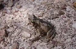Males measure 33–46 mm (1.3–1.8 in) and females 46–51 mm (1.8–2.0 in) in snout–vent length.[2][4] The species has a robust appearance. The snout is rounded with a small apical apophysis in dorsal view and sub-acuminate in lateral profile. The coloration is variable. The dorsum is generally light brown to dark brown. Light-colored individuals have no pattern or have a cream vertebral line. Darker specimens have a broadish, light brown vertebral stripe. There is a black, triangular inter-ocular spot facing backward, as well as an oblong dorsal blackish spot that connects to another black spot near the urostyle. The belly is light creamy, marbled with light gray.[2]