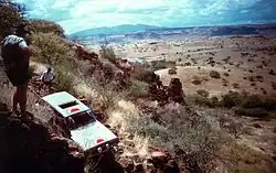 Based on this experience and after much discussion, Rob and Brian decided to attempt an event to drive over Mount Suswa in the Rift Valley. Two controls would be sited on either side of the Volcano and whoever did it in the shortest distance would be the winner. One Sunday morning in early 1989 the two set off, with motor bikes, headed for the southern slopes of Mount Suswa. After an exhausting day mostly "carrying" the bikes, and still only halfway up Mount Suswa they had to head back to base, the idea wasn't going to work! They sat looking across the Suswa plains with Lake Magadi in the distance, several small hills and large luggas in the foreground. Why not put a control on the top of each hill and one at the bottom of the escarpment? The competitors would have to find their way across the luggas to get to the hills! The following weekend, prepared with camping gear, motor bikes and their families, they spent two days driving and riding around the area setting out what eventually became the venue for the first ever Rhino Charge. Thirty-one competing vehicles entered 4 February 1989 event won by Travers Allison in a Suzuki Jeep. Distance was measured with the vehicle's standard odometer. These pioneers probably had no idea of the huge interest this small event would attract in the years to come.