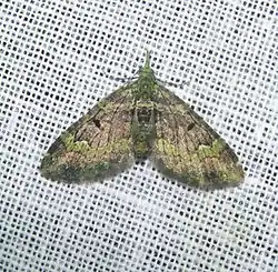 Its wingspan is about 24 mm. Palpi with second joint reaching far beyond the frontal tuft. Hindwings with vein 3 from before angle of cell. Hindwings lack tufts or fovea below lower angle of cell. Body grass green with black irrorations and more or less vinous reddish suffusion. Abdomen with black second segment. Forewings with veins speckled with black. A sub-basal line and an antemedial vinous and black band found with a line beyond it. The medial area vinous and black, with a black cell-spot and edged by black lines, the outer edge angled at veins 6 and 4 and with white between those points. There is a postmedial black specks series and a submarginal vinous band found with a black line on it and black inner edge, which outwardly edged by a crenulate white line. Cilia greenish and black. Hindwings with pale fuscous or whitish colored with traces of waved lines on outer area.[2]