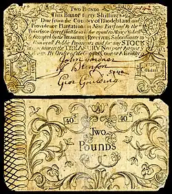 The pound was the currency of Rhode Island until 1793. Initially, sterling coin and foreign coins circulated, supplemented by local paper money from 1710.[1] These notes were denominated in £sd, but they were worth less than sterling, with 1 Rhode Island shilling = 9d sterling. The first issue of notes was known as the "Old Tenor" issue. This fell in value and "New Tenor" notes were introduced in 1740, worth four times the Old Tenor notes. Both Old and New Tenor notes were replaced in 1763 by "Lawful money" at a rate of 1 Lawful shilling = 6+2⁄3 New Tenor shillings = 26+2⁄3 old Tenor shills.
