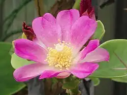 Rhodocactus was originally described as a subgenus of Pereskia by Alwin Berger, and was raised to a genus in 1936 by Frederik Marcus Knuth.[1][3] The genus was later sunk back into in a broadly defined genus Pereskia. Molecular phylogenetic studies from 2005 onwards suggested that when circumscribed in this way, Pereskia was not monophyletic, and consisted of three clades.[5][6][3] By 2016, each clade was recognized as a separate genus, one of which is Rhodocactus. Only the type species of Knuth's circumscription of the genus, Rhodocactus grandifolius, belongs to the clade re-described as Rhodocactus. The other species were mostly newly transferred from Pereskia.[3]